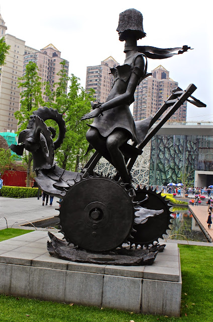 Lauantaina heräsin siis väsyneenä pilviseen päivään. Vesa ja Onni päättivät pitää kotipäivän, eivätkä he halunneet lähteä kaupungille. Me Emman kanssa sen sijaan menimme kaupungille ja puistoon. Kävimme Shanghai Natural History-museon yhteydessä olevassa Jing'an Sculpture-puistossa. Museo on varmasti kiva vierailukohde myös, mutta en suosittele menemään sinne lauantaina. Jono museoon oli nimittäin älyttömän pitkä! Paikka on varmasti oiva vierailukohde lasten lomien aikaan, kunhan menee viikolla ja heti aamusta. Museon edessä oleva puisto on myös kiva ja Emman kanssa intouduimme ottamaan kuvia puistossa, siellä on kivoja kuvauskohteita ja hauskoja patsaita.